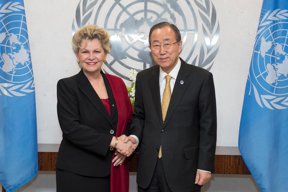 Caption Description Katalin Annamária Bogyay (left), new Permanent Representative of Hungary to the United Nations, shakes hands with Secretary-General Ban Ki-moon, after presenting her credentials.