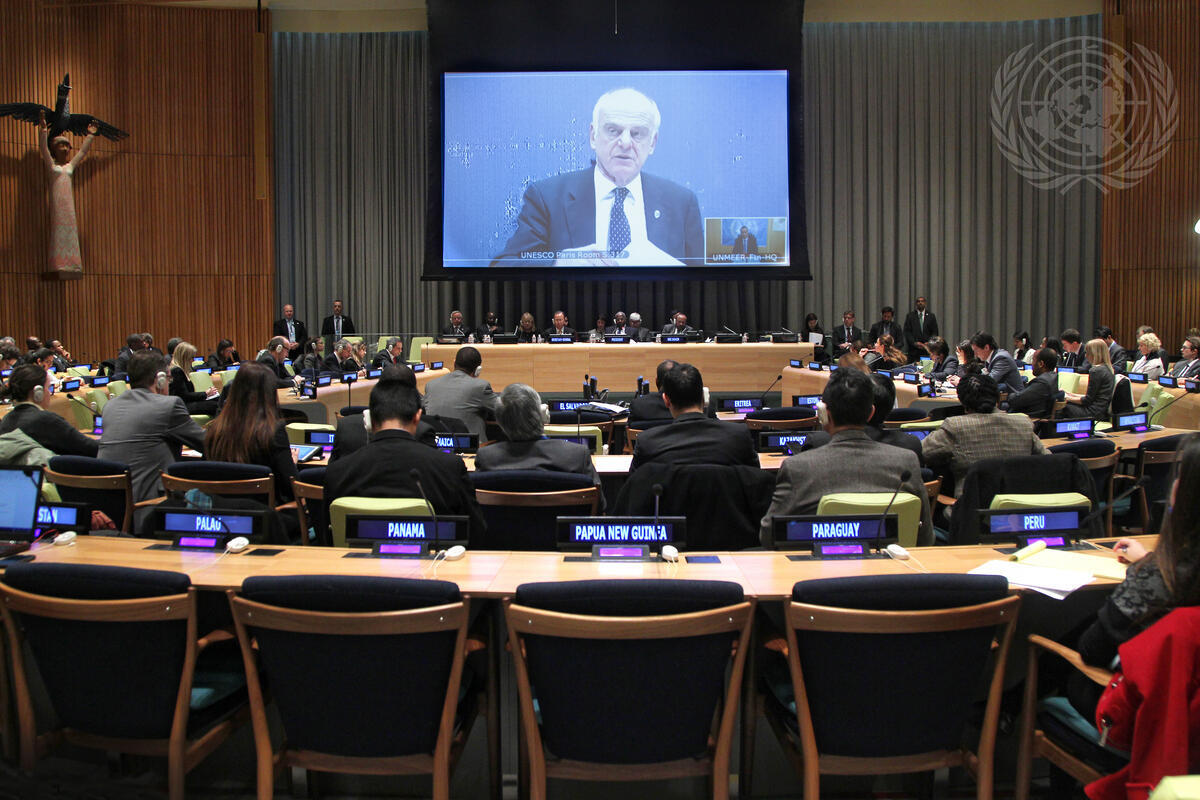 David Nabarro (on screen), Special Envoy of the Secretary-General on Ebola, briefs the General Assembly via video-link from Paris, France.