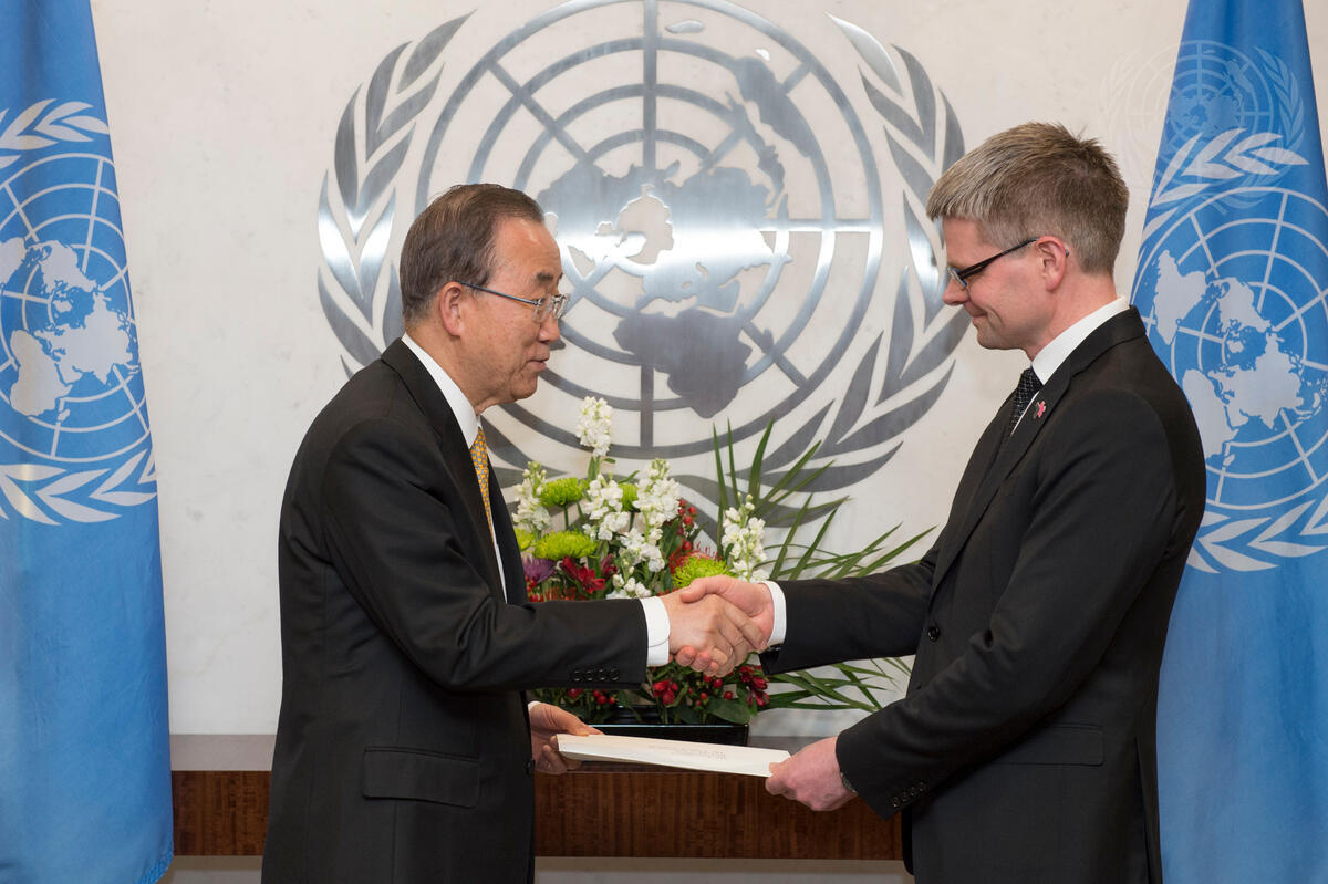 Einar Gunnarsson (right), new Permanent Representative of Iceland to the United Nations, presents his credentials to Secretary-General Ban Ki-moon.