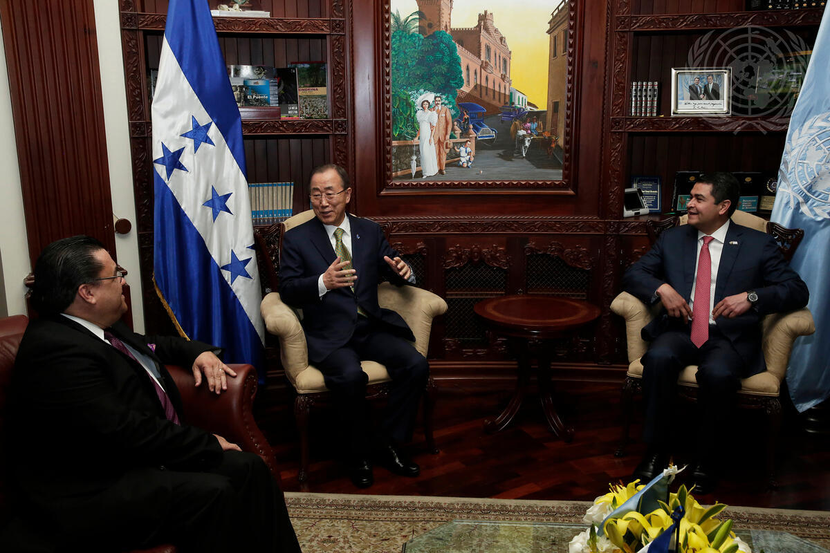 Secretary-General Ban Ki-moon (centre) meets with President of Honduras Juan Orlando Hernández (right) and Arturo Corrales Álvarez, head of the Ministry of Foreign Affairs and International Cooperation, at the Presidential House in Tegucigalpa today.