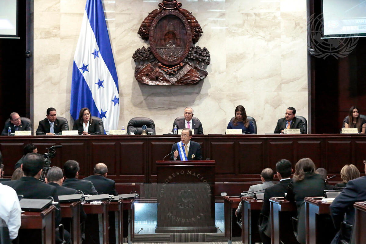 Secretary-General Ban Ki-moon (centre) addresses the National Congress of Honduras. On his first ever visit to Honduras, Mr. Ban urged the National Congress to draw on the tremendous diversity and voices of all the country's people as they undertake measures to address poverty, inequality and insecurity and move towards sustainable development. He was also awarded the Gran Cruz Extraordinaria con Placa de Oro.