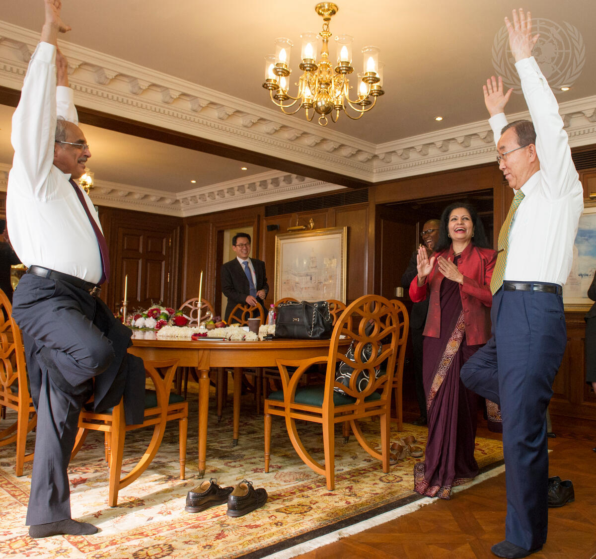 Secretary-General Ban Ki-moon gets a yoga lesson from Vijay Nambiar, the Secretary-General's Special Adviser on Myanmar.