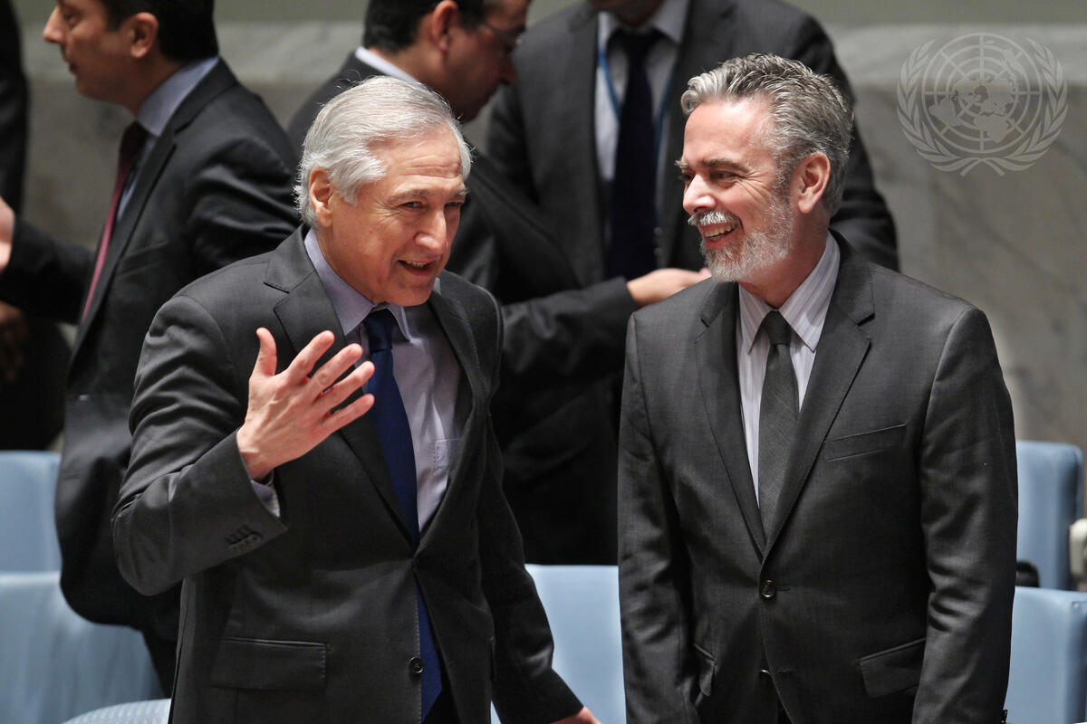 Heraldo Muñoz (left), Minister for Foreign Affairs of Chile and President of the Security Council for January, speaks with Antonio de Aguiar Patriota, Permanent Representative of Brazil to the UN and Chair of the Peacebuilding Commission, at the Security Council meeting on post-conflict peacebuilding.