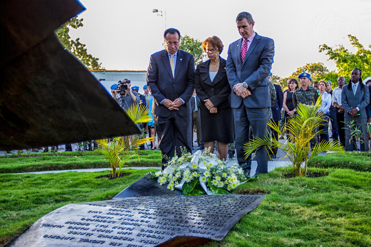 Sandra Honoré (centre) Head of UN Stabilization Mission in Haiti, Carl Alexandre (left), Deputy Special Representative for UN Stabilization Mission in Haiti, and Peter de Clercq (right), UN Resident Coordinator and Humanitarian Coordinator, pay tribute to fallen staff members.