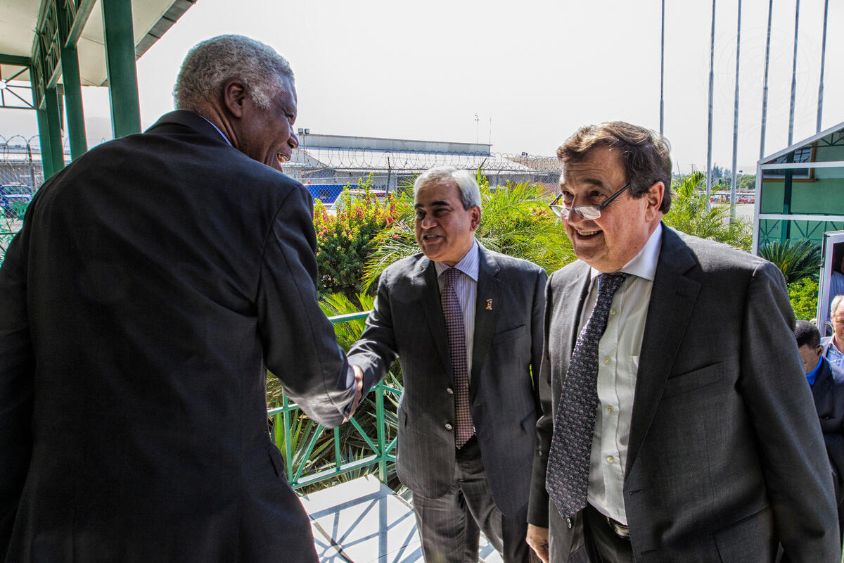 Duly Brutus (left), Minister for Foreign Affairs of Haiti, welcomes members of the Security Council, including José Filipe Moraes Cabral (centre) of Portugal and Cristián Barros Melet (right) of Chile, upon their arrival in Port-au-Prince, Haiti.