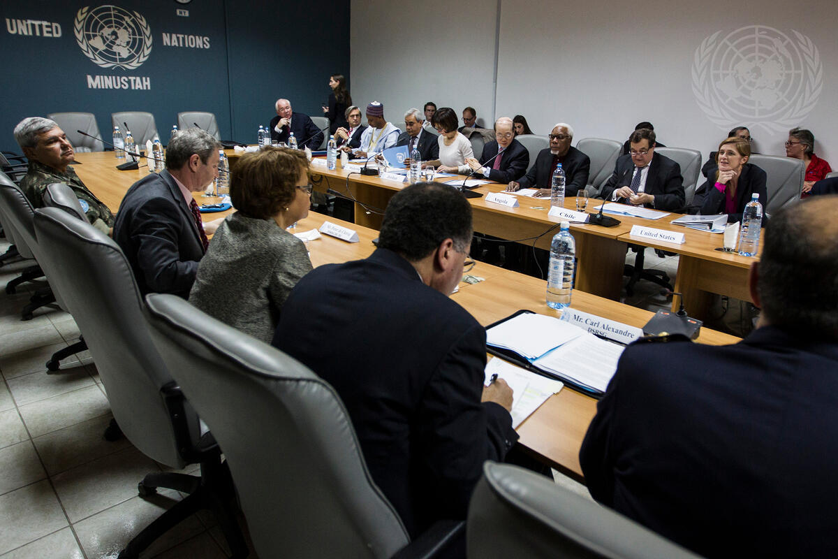 Security Council delegation meets with Sandra Honoré (foreground centre), Special Representative of the Secretary-General and Head of the United Nations Stabilization Mission in Haiti (MINUSTAH), and MINSUTAH staff members.