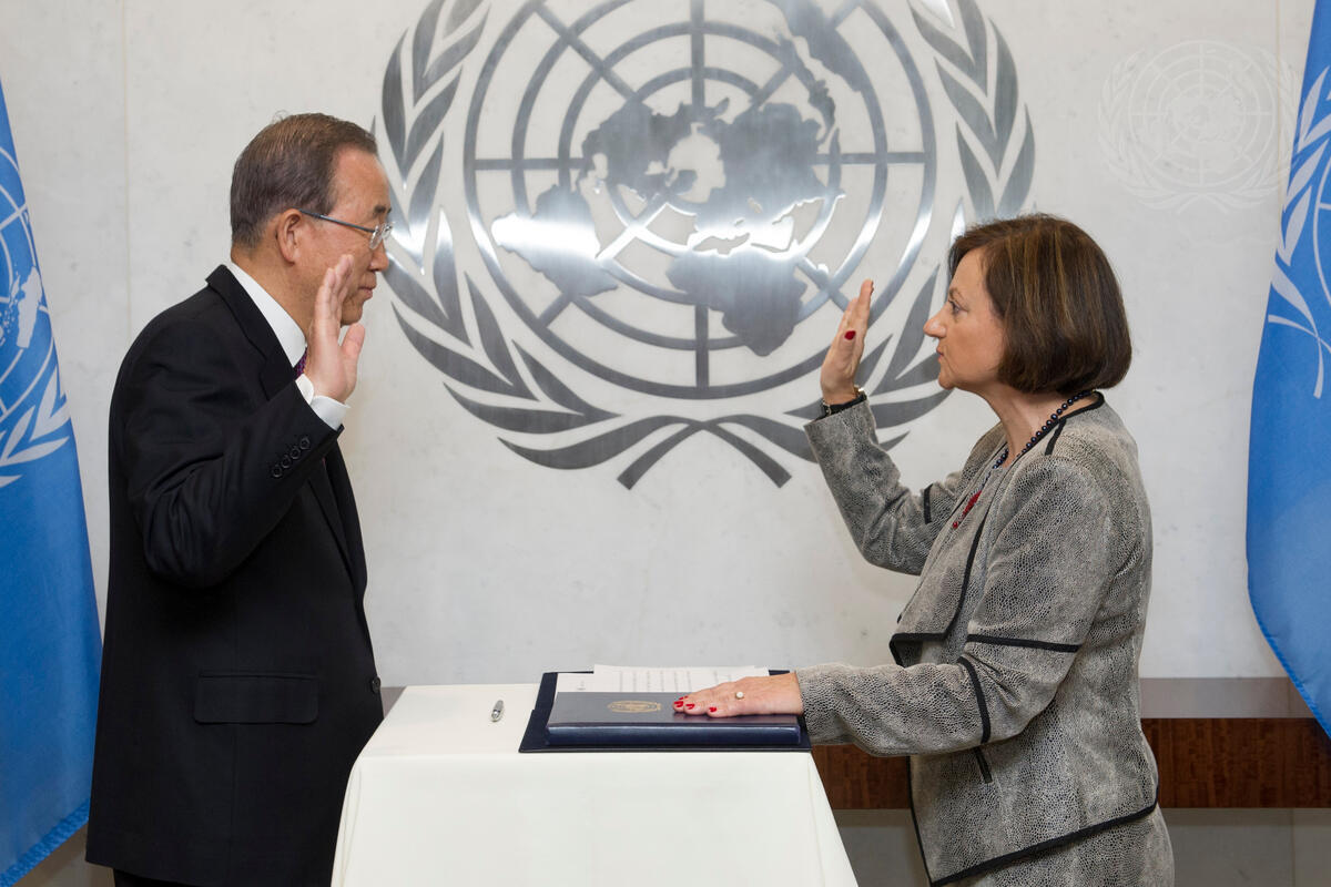 Secretary-General Ban Ki-moon (left) swears in Cristina Gallach, new Under-Secretary-General for Communications and Public Information.