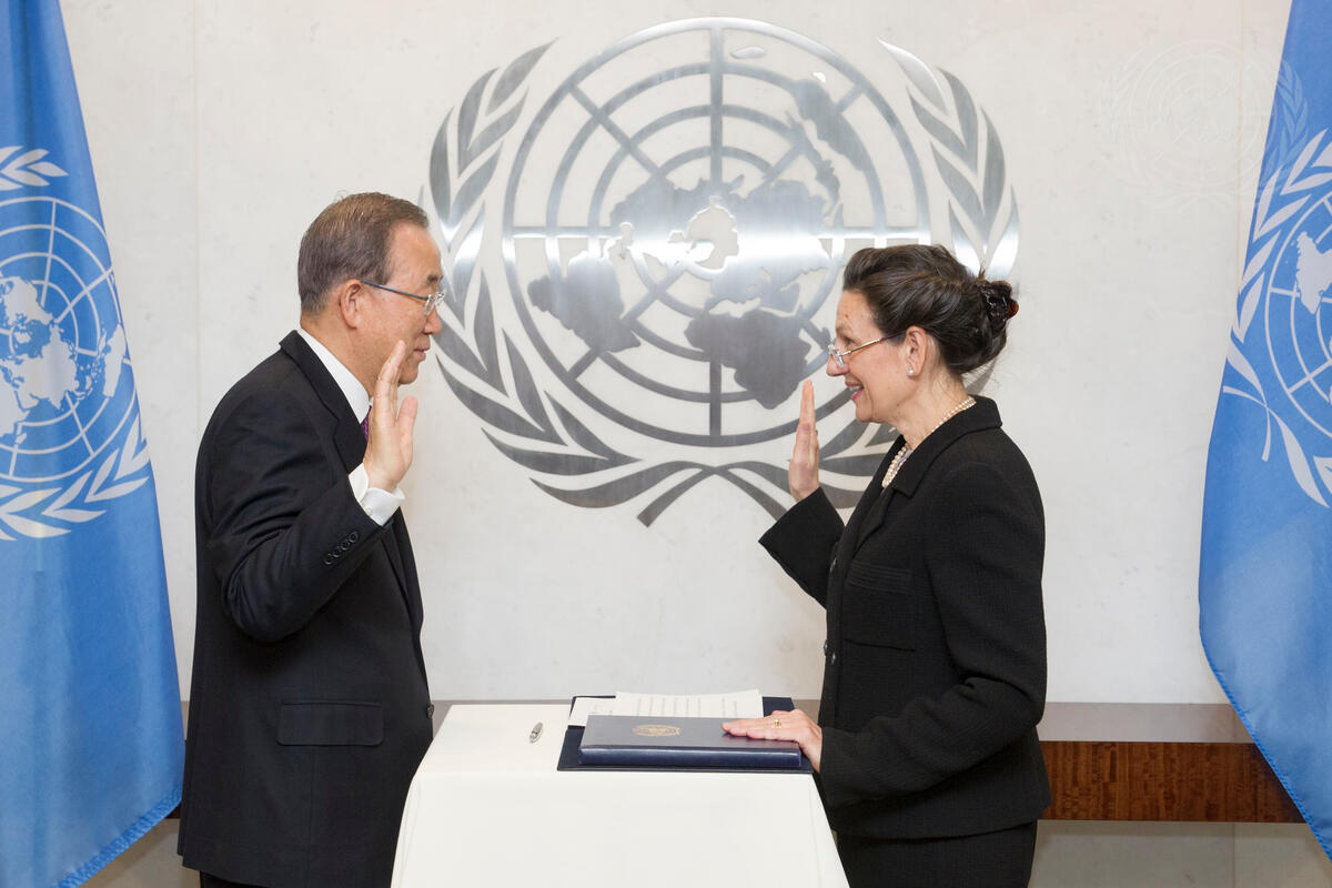 Secretary-General Ban Ki-moon (left) swears in Bettina Tucci Bartsiotas, new Assistant Secretary-General and Controller, Office of Programme Planning, Budget and Accounts, Department of Management.