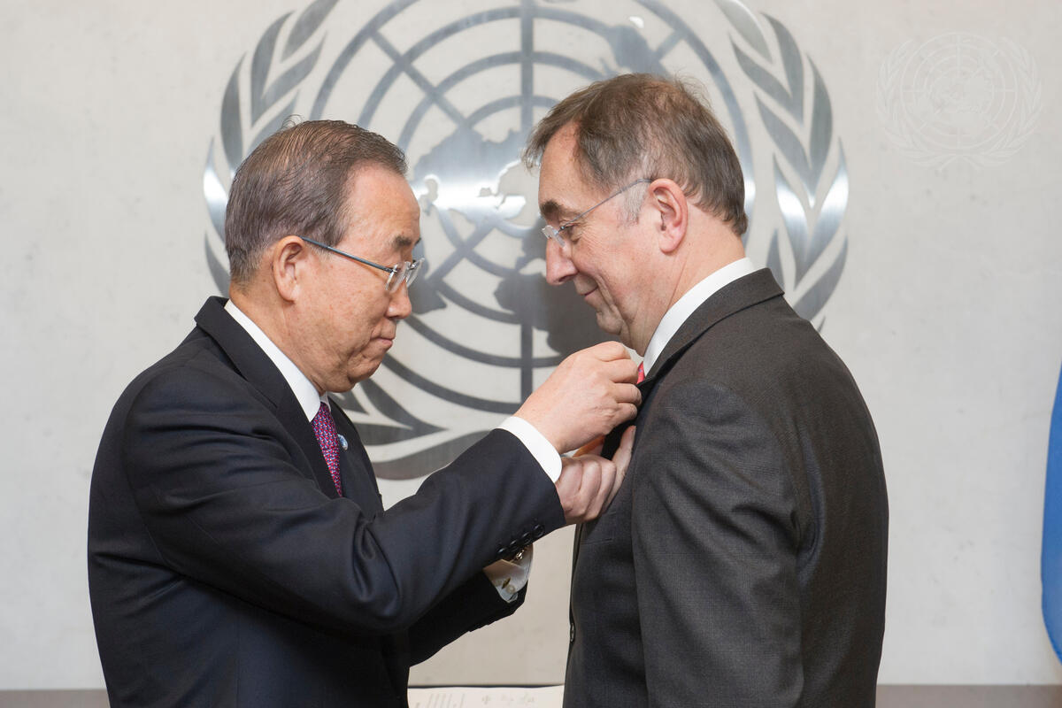 Secretary-General Ban Ki-moon (left) affixes a UN lapel pin for Janos Pasztor, newly sworn in Assistant Secretary-General on Climate Change and Senior Adviser of the Secretary-General on climate change.