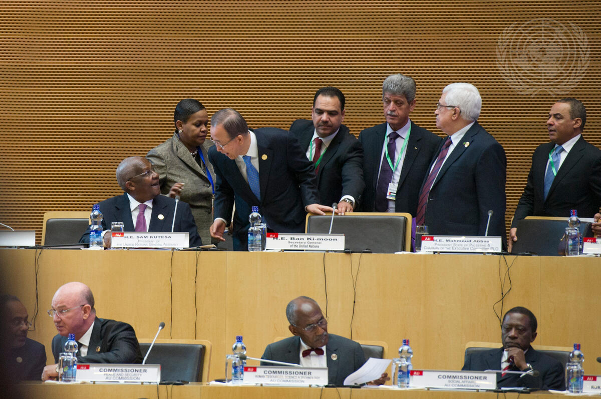 Secretary-General Ban Ki-moon (third from left) greets Sam Kutesa, President of the sixty-ninth session of the UN General Assembly, at the opening of the 24th Summit of the African Union. Also pictured: Mahmoud Abbas (second from right), President of the State of Palestine.
