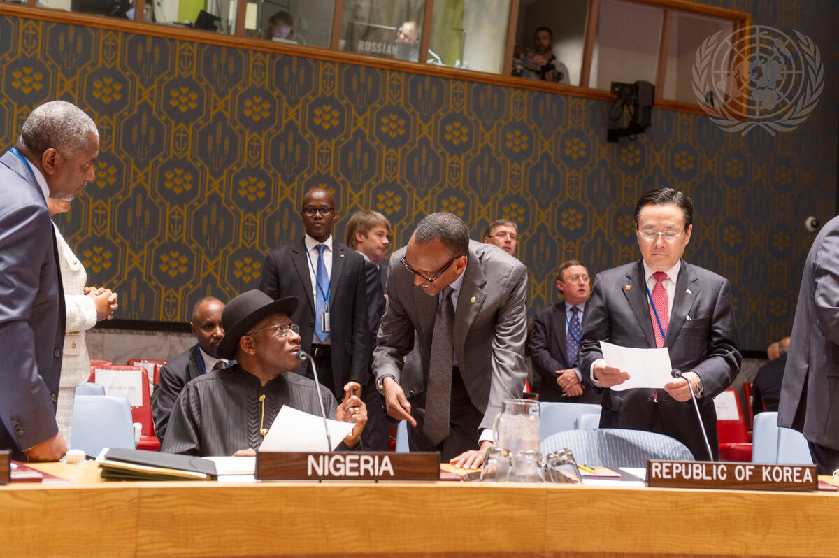 Paul Kagame (centre), President of the Republic of Rwanda, speaks with Goodluck Ebele Jonathan (seated left), President of Nigeria, at the Council summit.