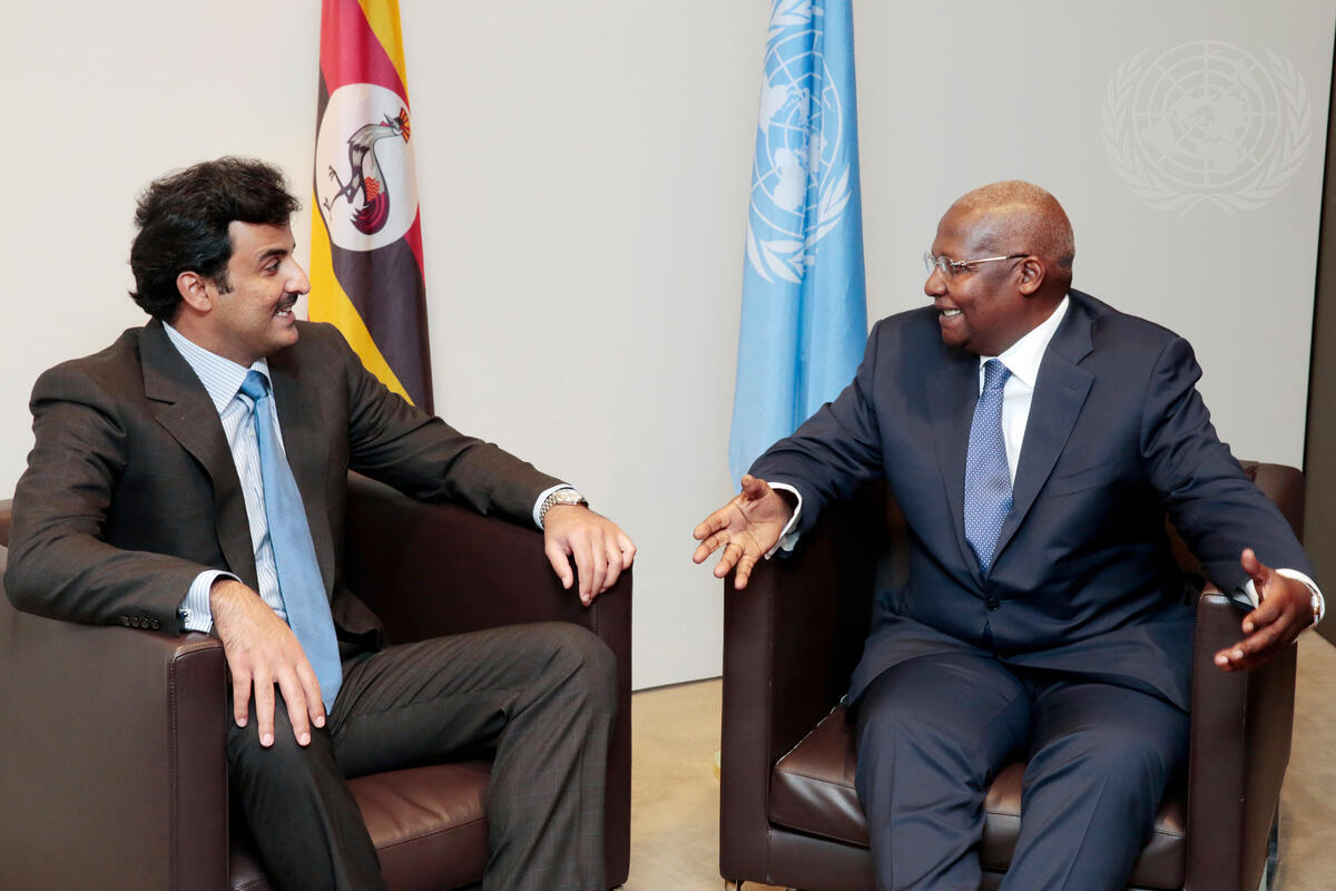 Sam Kahamba Kutesa (right), President of the sixty-ninth session of the General Assembly, meets with Sheikh Tamim bin Hamad Al-Thani, Amir of the State of Qatar.