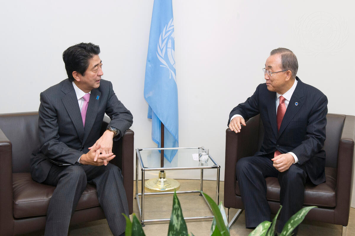 Secretary-General Ban Ki-moon (right) meets with Shinzo Abe, Prime Minister of Japan.