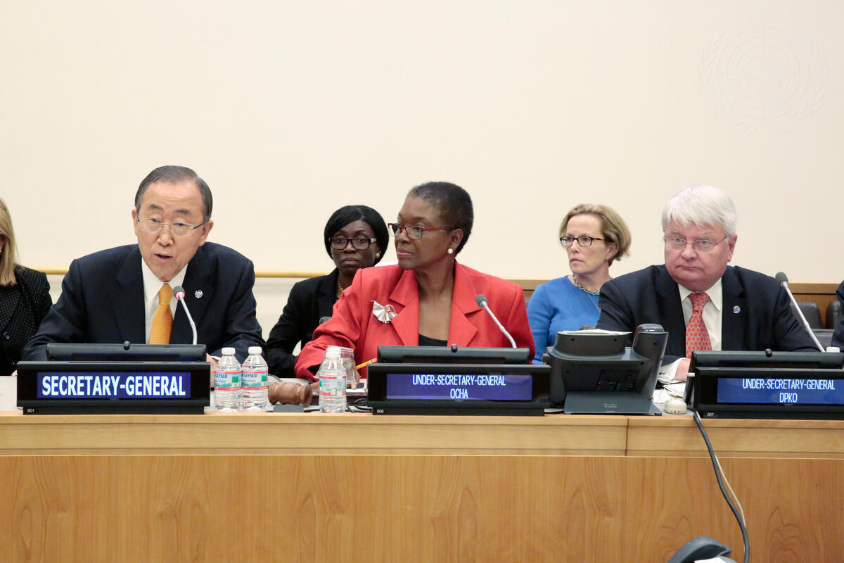 Secretary-General Ban Ki-moon (left) addresses a high-level ministerial meeting on South Sudan, organized by the Office for the Coordination of Humanitarian Affairs (OCHA). To his left at the podium: Valerie Amos (centre), Under-Secretary-General for Humanitarian Affairs and Emergency Relief Coordinator, and Hervé Ladsous, Under-Secretary-General for Peacekeeping Operations.