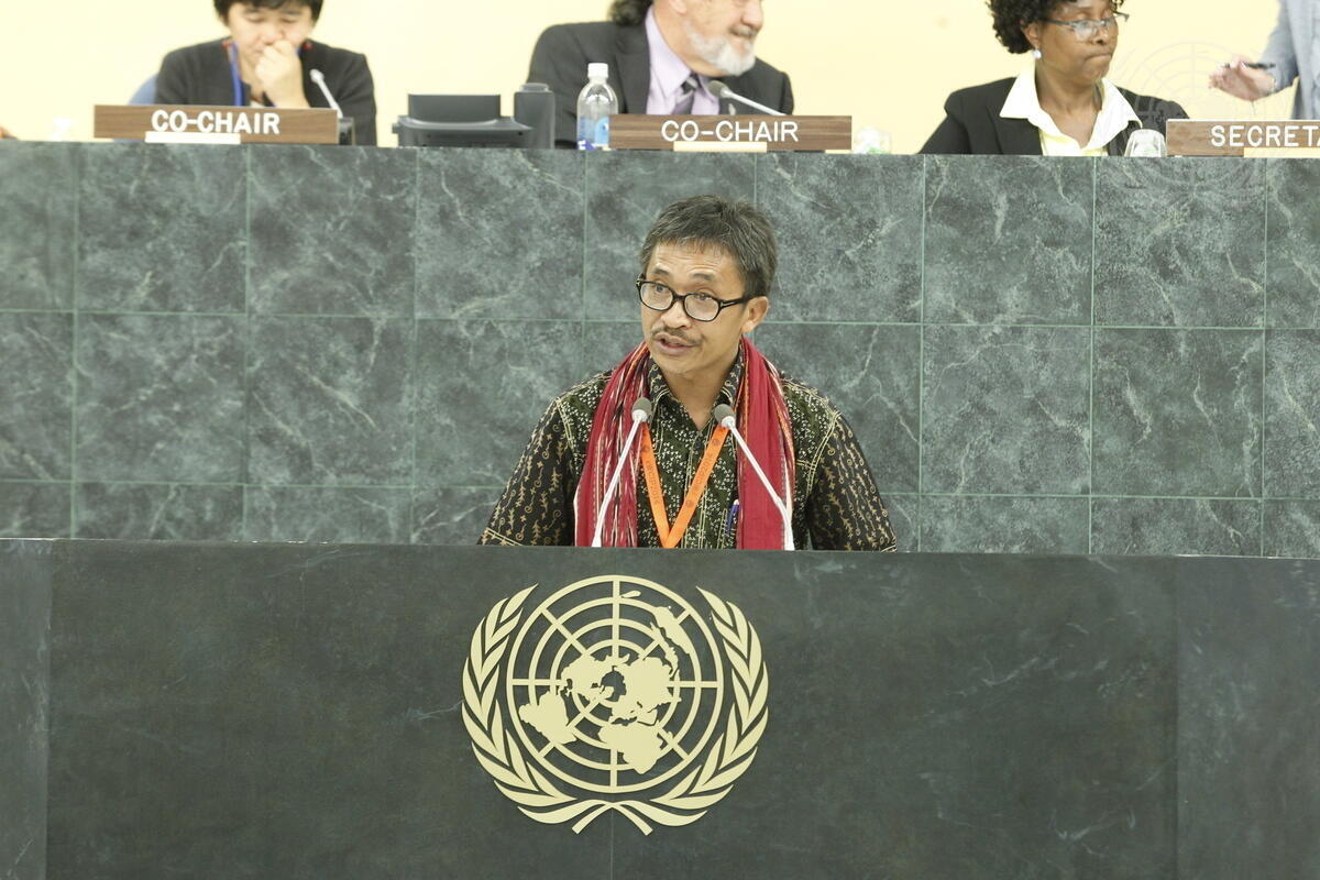 Abdon Nababan, Aliansi Masyarakat Adat Nusantara (AMAN), speaks at today's round table discussion on ""Indigenous Peoples' Lands, Territories and Resources"", taking place as part of the first World Conference on Indigenous Peoples (WCIP).