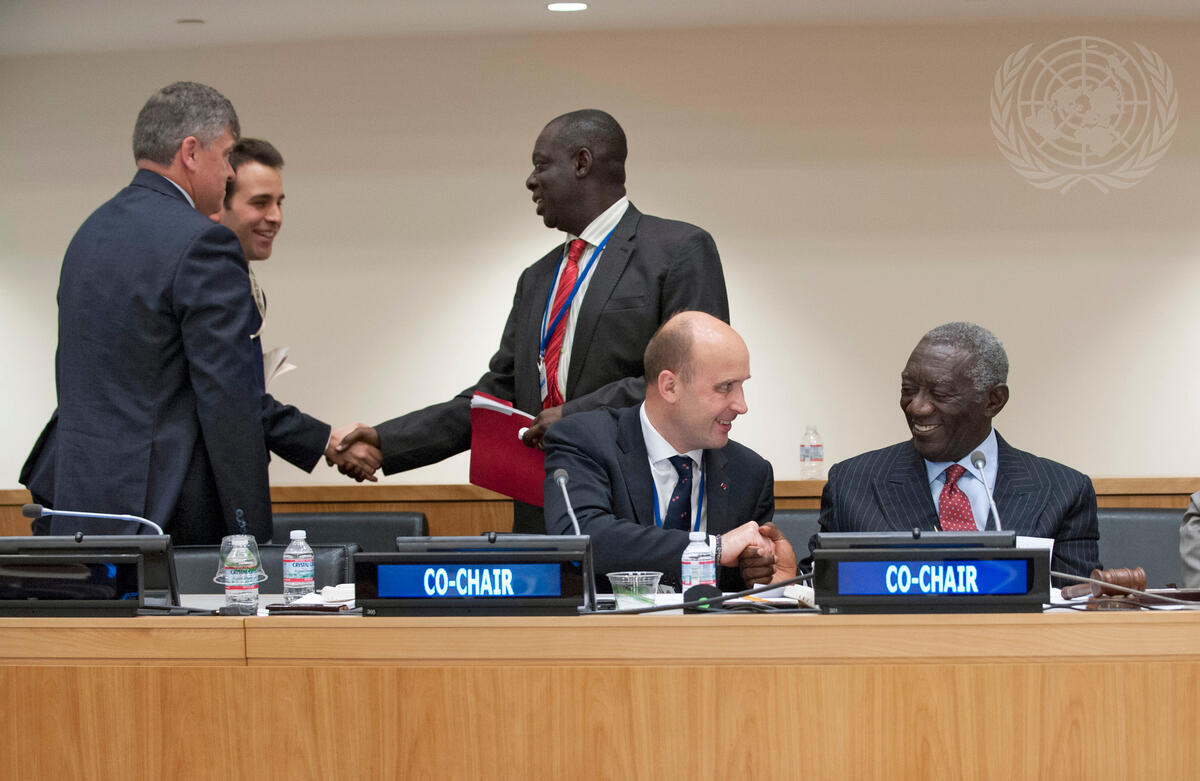 Marcin Korolec (seated, left), former Minister of Environment of Poland and President the COP19 in Warsaw, greets his co-chair, John Agyekum Kufuor, former President of Ghana and Special Envoy of the Secretary-General on Climate Change, for one of the plenary sessions on National Action and Ambition Announcements on climate action. The meeting is part of the Climate Summit, being held today at UN Headquarters in New York.