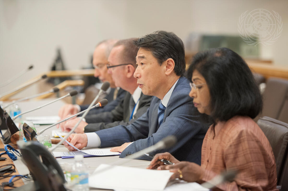 Oh Joon (second from right), Permanent Representative of the Republic of Korea to the UN, speaks at the event. He is flanked by Jeffrey Feltman (left), Under-Secretary-General for Political Affairs; and Ameerah Haq, Vice-Chair of the UN High-level Independent Panel on Peace Operations.