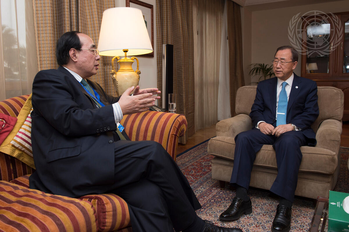 Secretary-General Ban Ki-moon (right) is being briefed by Wu Hongbo, Under-Secretary-General for Economic and Social Affairs, upon arrival in Addis Ababa, Ethiopia, on the eve of the opening of the Third International Conference on Financing for Development (FFD3).