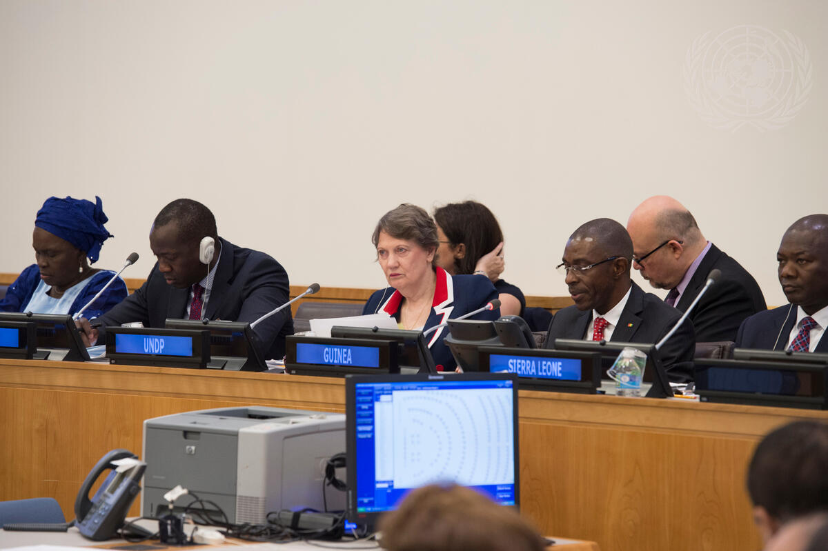 Helen Clark (centre), Administrator of the UN Development Programme (UNDP), addresses the Technical Consultations of the International Ebola Recovery Conference.