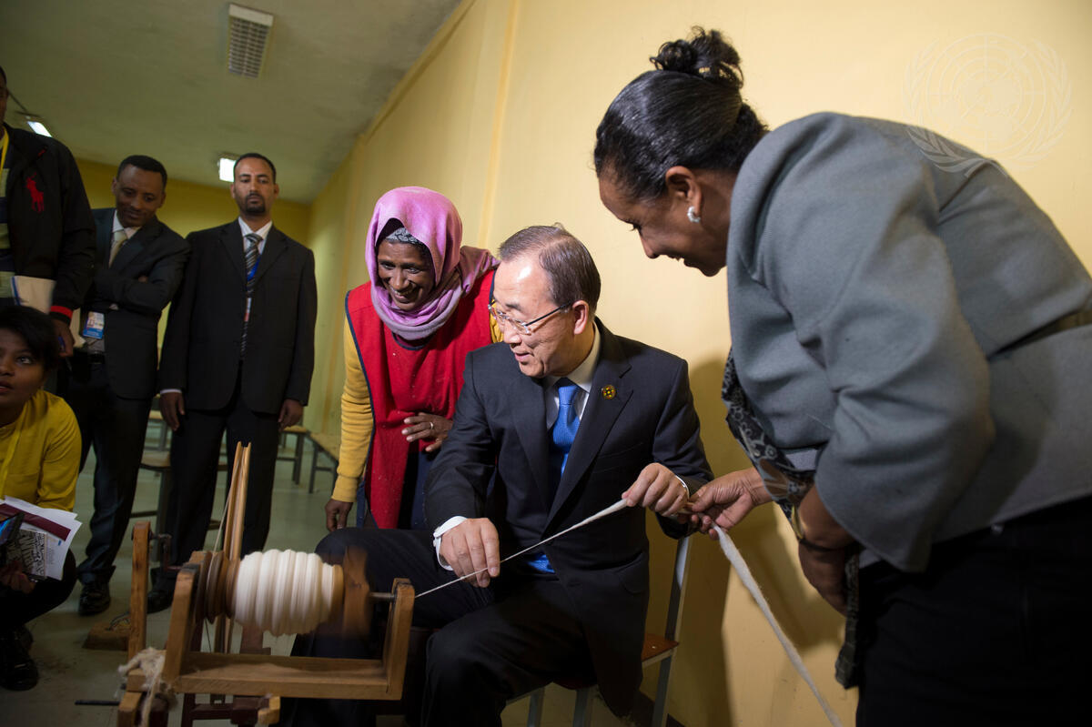 Secretary-General Ban Ki-moon (second from right) during his visit to the project known as “Connecting 1,500 Women and Girls to the Export Market”, in Addis Ababa. The project trains women and girls to develop skills in industries such as leather, weaving, basketry, embroidery, gemstones, and spinning.