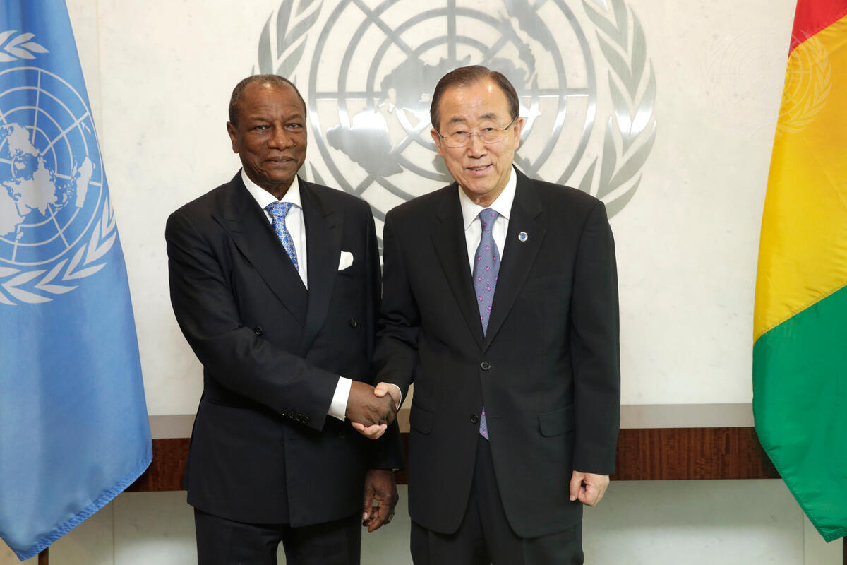 Secretary-General Ban Ki-moon (right) meets with Alpha Condé, President of the Republic of Guinea.