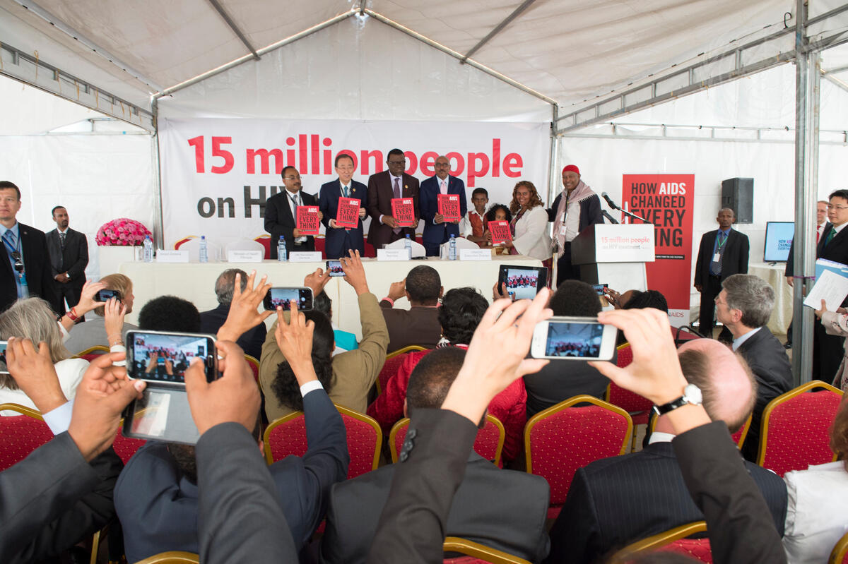 Secretary-General Ban Ki-moon (second from left on stage) during the launch of the UNAIDS report at Zewditu Hospital in Addis Ababa.