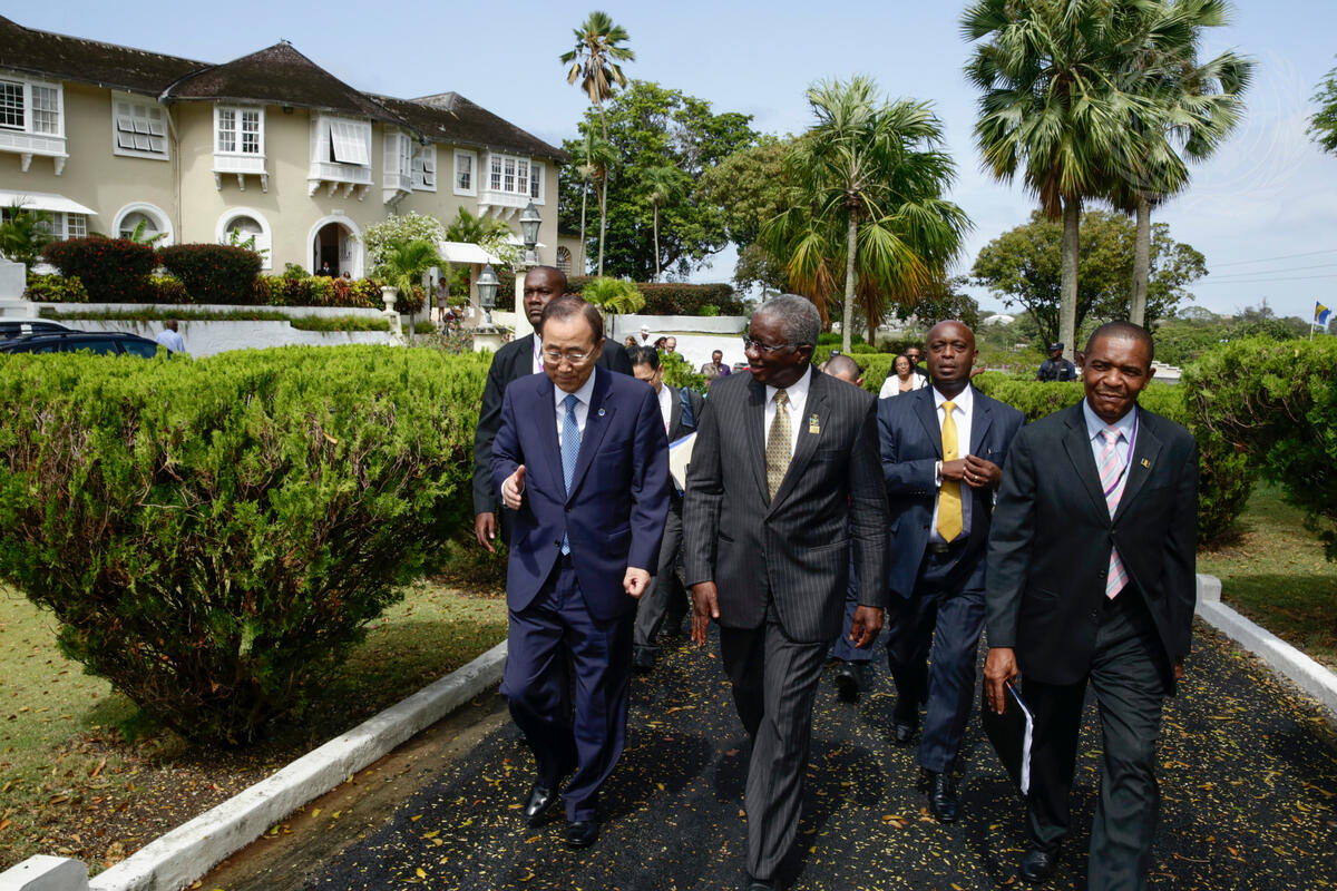 Secretary-General Ban Ki-moon (right) and Prime Minister of Barbados, Freundel Stuart, walk to the Lloyd Erskine Sandiford Conference and Cultural Centre.