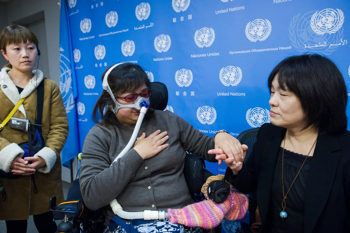 Akiko Fukuda (centre), Secretary-General of the World Federation of the Deafblind, communicates in tactile sign language at a press conference entitled “Disability-Inclusive Disaster Risk Reduction: Inclusion saves lives – Toward a disability-inclusive post-2015 development framework”.