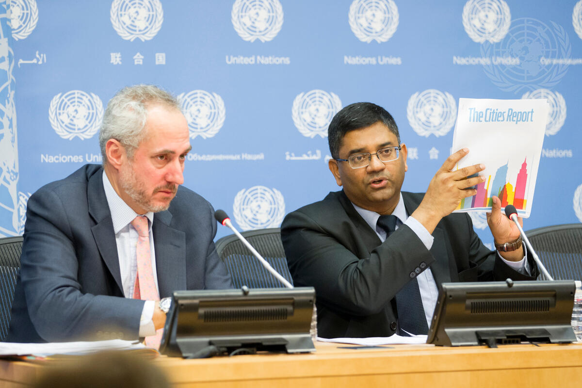 Simon Bland (right), Director of the New York Office of the Joint UN Programme on HIV/AIDS (UNAIDS), briefs journalists on the occasion of World AIDS Day (1 December). Marking the Day, UNAIDS released a report on HIV in cities, outlining the important role that urban areas will play in ending the epidemic. Pictured at Mr. Bland’s side is Stéphane Dujarric, Spokesperson for the Secretary-General.