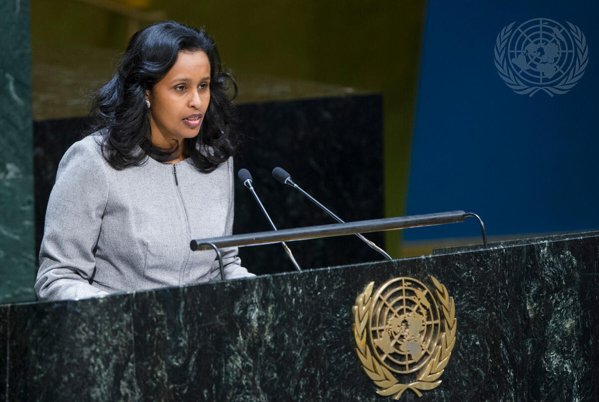 Saada Daher Hassan (Djibouti), Rapporteur of the First Committee, presents the Committee’s reports to the Assembly.