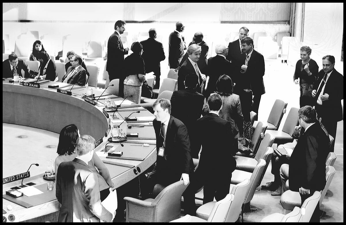 Delegates at the Security Council’s meeting on its own working methods -- including Román Oyarzun Marchesi (centre), Permanent Representative of Spain to the UN and Council President for October.
