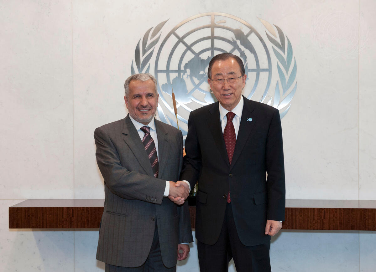 Secretary-General Ban Ki-moon (right) meets with Abdullah Al-Rabiah, General Supervisor of the King Salman Humanitarian Aid and Relief Centre and adviser at the Royal Court in Saudi Arabia.