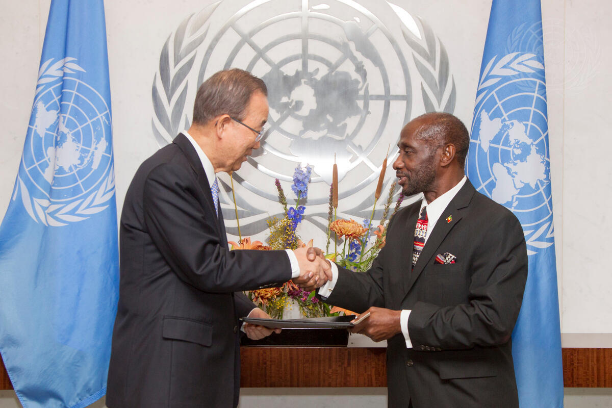 Sam Terrence Condor (right), new Permanent Representative of Saint Kitts and Nevis to the United Nations, presents his credentials to Secretary-General Ban Ki-moon.