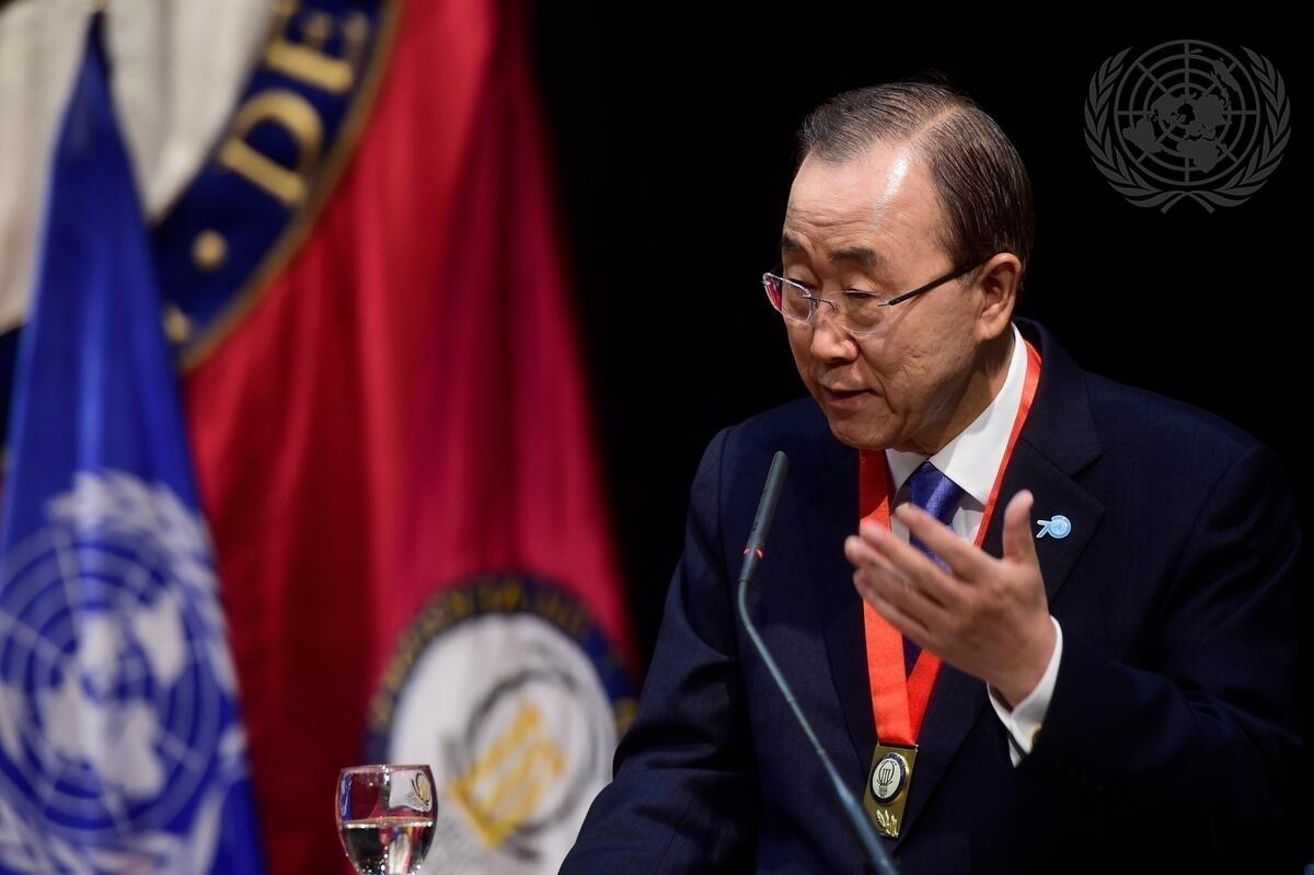 Secretary-General Ban Ki-moon speaking during the ceremony at Carlos III University of Madrid, Spain, where he received a Medal of Honour.