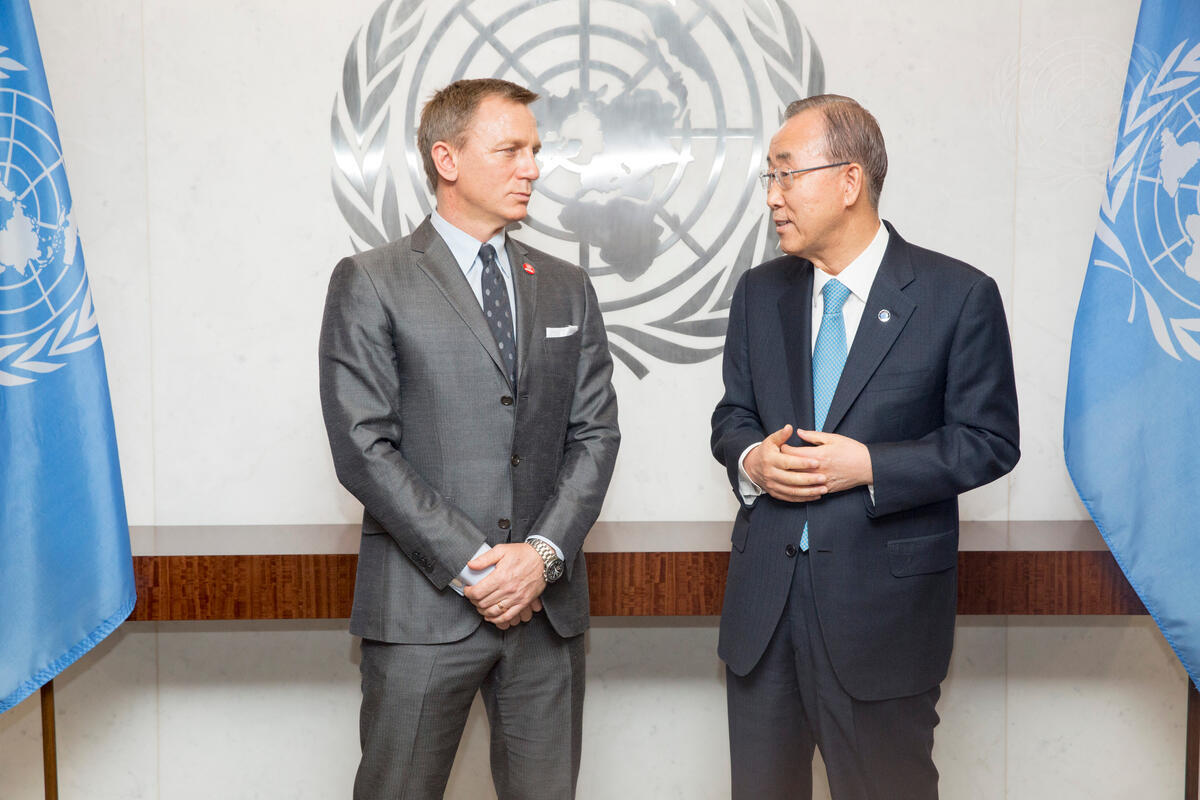 Secretary-General Ban Ki-moon (right) meets with actor Daniel Craig and designates him as the UN Global Advocate for the Elimination of Mines and Other Explosive Hazards for the next three years. Announcing the designation, the Secretary-General thanked Mr. Craig – known for playing James Bond – for using his star power to draw attention to the causes of mine destruction and mine awareness.