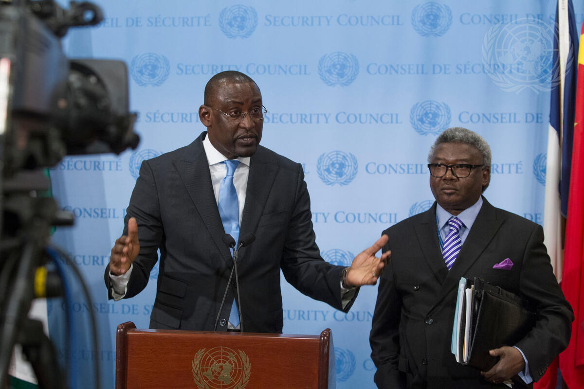 Abdoulaye Diop (left), Minister for Foreign Affairs and International Cooperation of the Republic of Mali, speaks to journalists after addressing a Security Council meeting on the situation in his country. Also pictured, Sékou Kassé, Permanent Representative of the Republic of Mali to the UN.