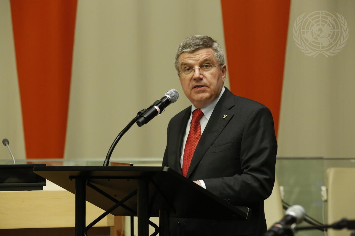 Thomas Bach (centre right), President of the International Olympics Committee (IOC), speaks at a special event on the theme, “United Action Towards Sustainable Development for All Through Sport”, held on the occasion of the International Day of Sport for Development and Peace (6 April).