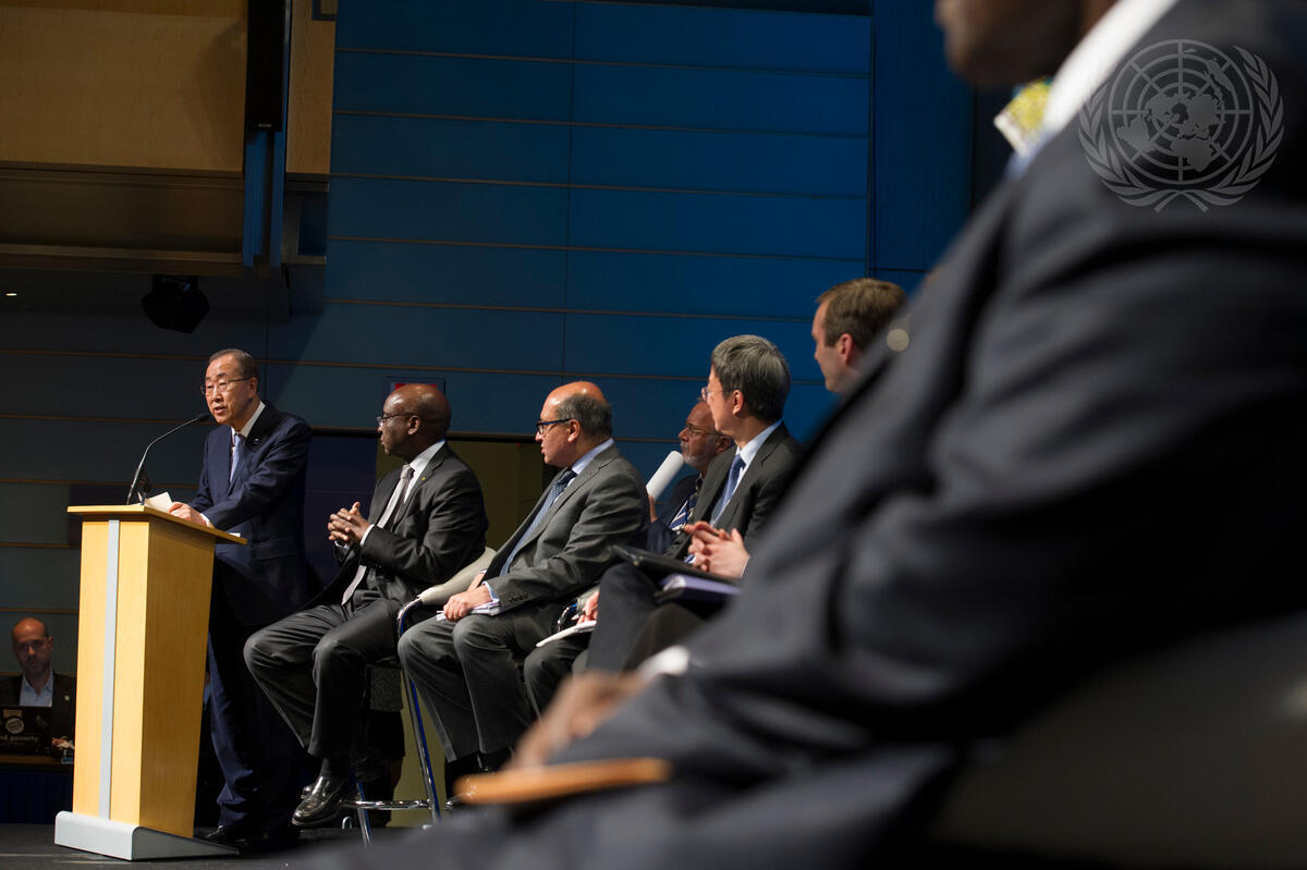 Secretary-General Ban Ki-moon (left) addresses a World Bank event on the theme “Changing the Conversation on Development Finance”.