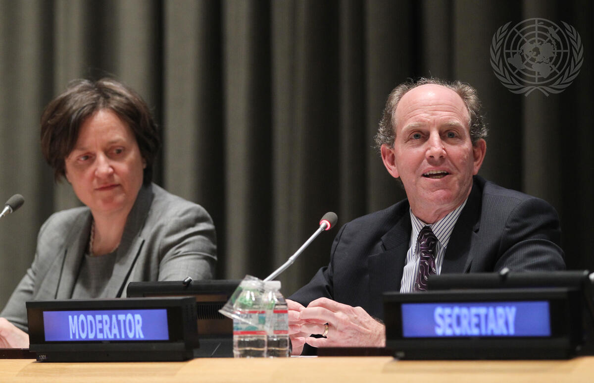Matthew Gamser (right), CEO of the SME (Small and Medium Enterprise) Finance Forum, moderates a panel discussion during the General Assembly’s interactive hearing with representatives of the business sector. The hearing was held as part of the preparatory process of the Third International Conference on Financing for Development, to take place in Addis Ababa, Ethiopia, from 13 to 16 July 2015. At left is Inez Murray, CEO of the Global Banking Alliance for Women.