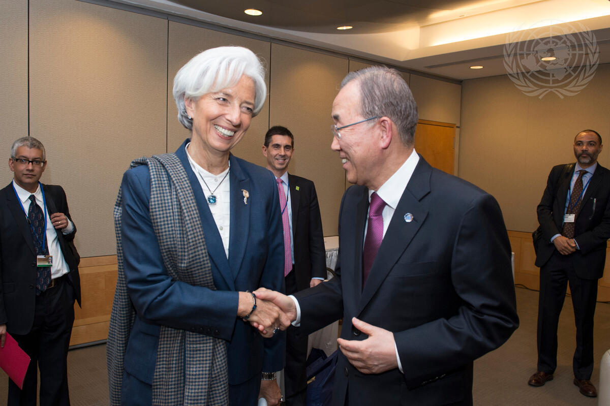 Secretary-General Ban Ki-moon (right) meets with Christine Lagarde, Managing Director of the International Monetary Fund (IMF), during the IMF's International Monetary and Finance Committee meeting.