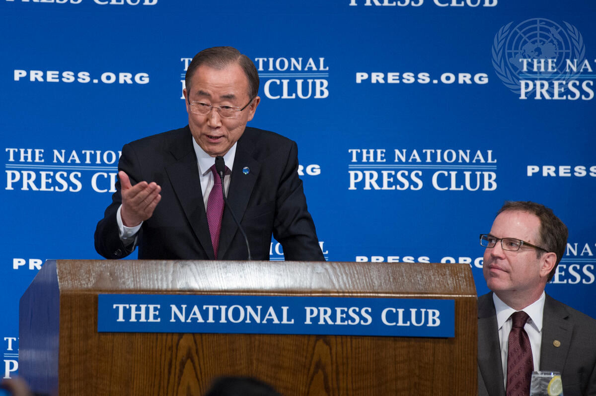 Secretary-General Ban Ki-moon (left) addresses the National Press Club in Washington, D.C. He discussed the challenges and opportunities that the United Nations faces in its 70th year, from fostering sustainable development and dealing with climate change to confronting violent extremism, and he took questions during an hour-long session. At right is John Hughes, President of the National Press Club.