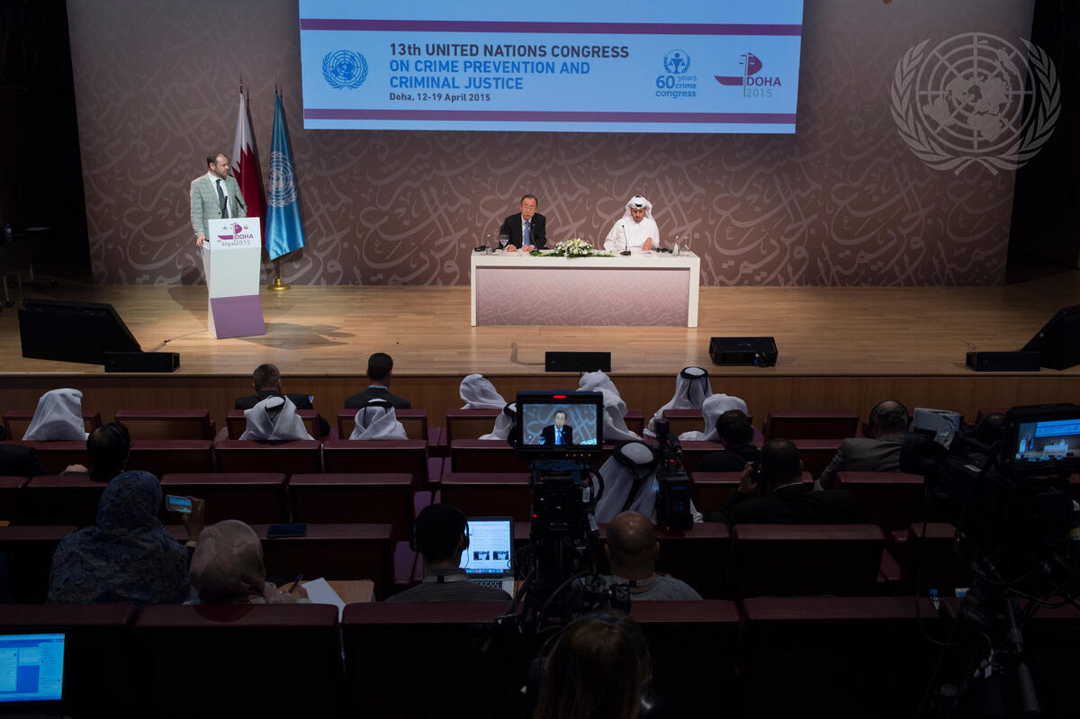 Secretary-General Ban Ki-moon (left on dais) holds a joint press conference with Sheikh Abdullah bin Nasser bin Khalifa Al-Thani (right on dais), Prime Minister and Minister for the Interior of the State of Qatar during the 13th United Nations Congress on Crime Prevention and Criminal Justice in Doha, Qatar.
