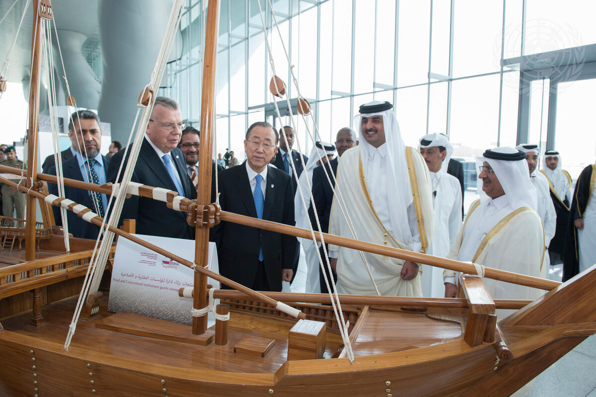 Secretary-General Ban Ki-moon (centre) with Sheikh Tamim bin Hamad Al-Thani (centre right), Amir of the State of Qatar in Doha, where the Secretary-General addressed the opening of the Thirteenth UN Congress on Crime Prevention and Criminal Justice. Pictured with them is Yury Fedotov (centre left), Executive Director of the UN Office on Drugs and Crime (UNODC).