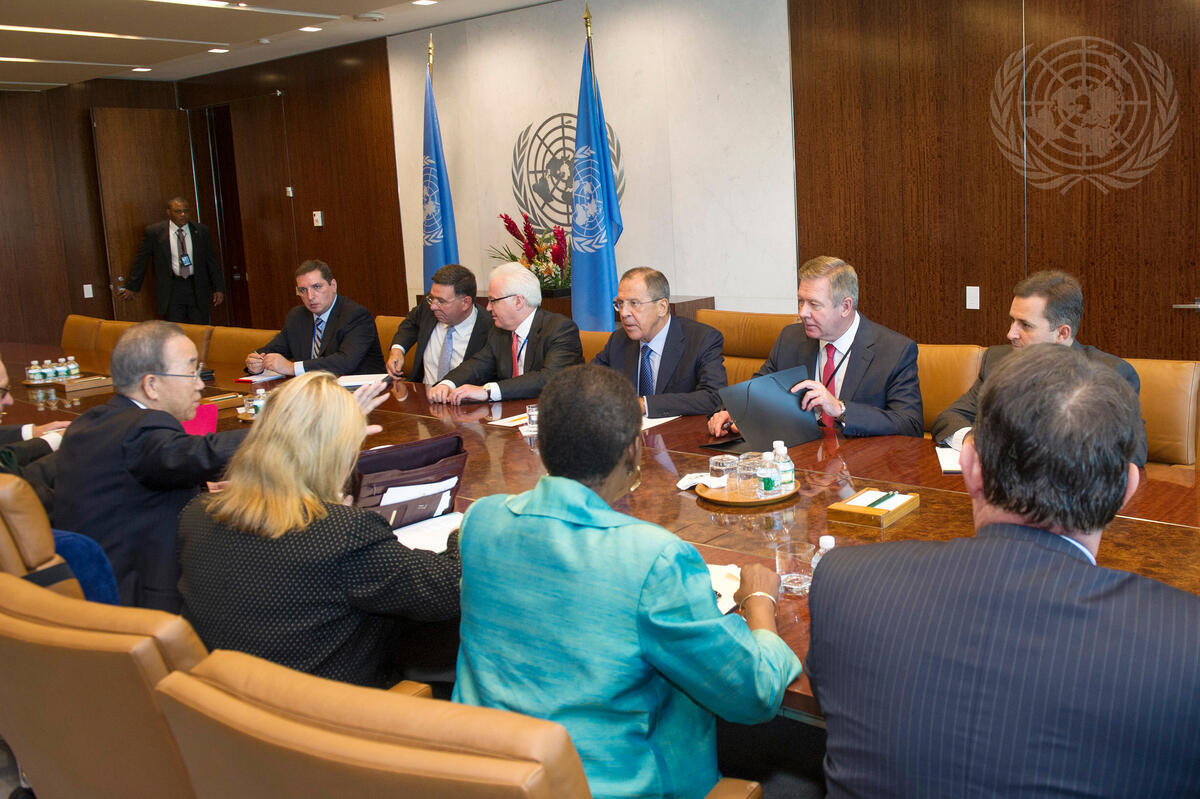 Secretary-General Ban Ki-moon (foreground left) meets with Sergey V. Lavrov (centre right top), Minister for Foreign Affairs of the Russian Federation.