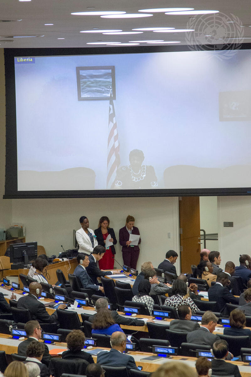 Ellen Johnson-Sirleaf (on screen), President of the Republic of Liberia, addresses a high-level meeting on the Response to the Ebola Virus Disease Outbreak through video conference.
