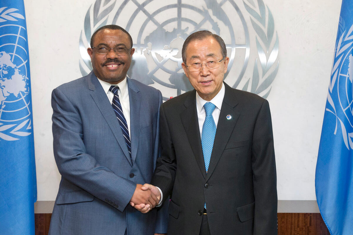 Secretary-General Ban Ki-moon (right) meets with Hailemariam Dessalegn, Prime Minister of the Federal Democratic Republic of Ethiopia.