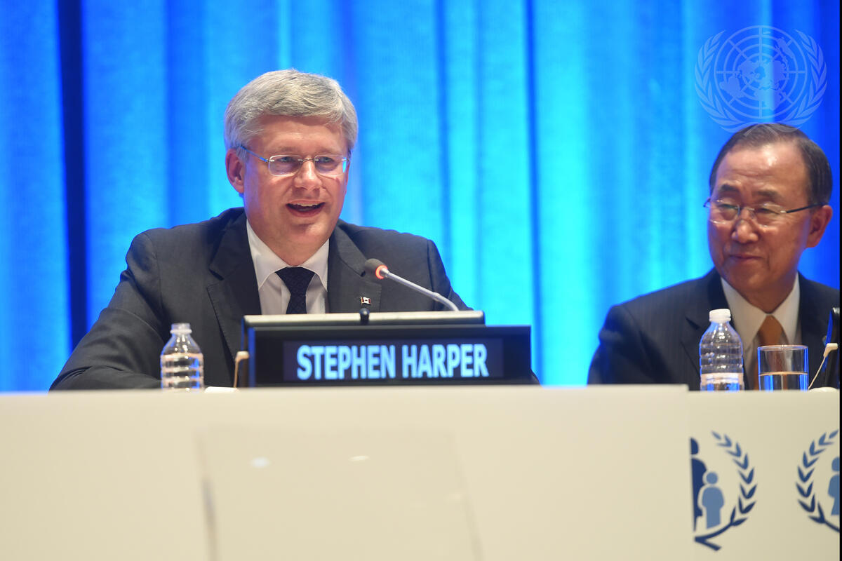 Stephen Harper (centre), Prime Minister of Canada, speaks at the event. Secretary-General Ban Ki-moon looks on.