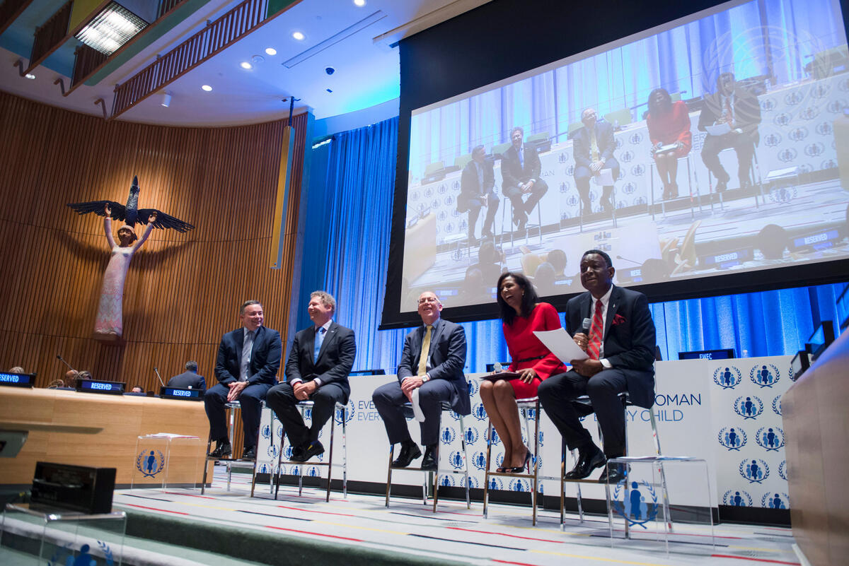 Babatunde Osotimehin, Executive Director of the United Nations Population Fund (UNFPA), chairs a discussion at today's event. Alsoon the panel are, from left: Miguel Veiga-Pestana, Vice President Sustainability Strategy and Global Advocacy; Seth Berkley, Chief Executive Officer (CEO) of the Global Alliance for Vaccines and Immunisation (GAVI); Michael Anderson, Chief Executive Officer of the Children’s Investment Fund Foundation (CIFF); Kim Simplis Barrow, Founder and Director of Lifeline Foundation, Special Envoy for Children and Women for Belize, and wife of Dean Barrow.