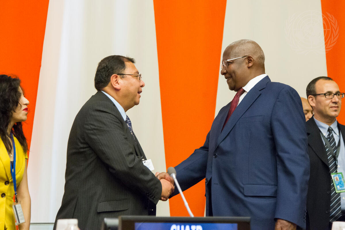 Sam Kahamba Kutesa (right), President of the sixty-ninth session of the General Assembly, greets Jose Antonio Zamora Gutierrez, Minister of Environment and Water for the Plurinational State of Bolivia, at the opening ceremony of the thirty-eighth annual meeting of Foreign Ministers of the Group of 77, taking place on the sidelines of the general debate of the sixty-ninth session of the General Assembly.