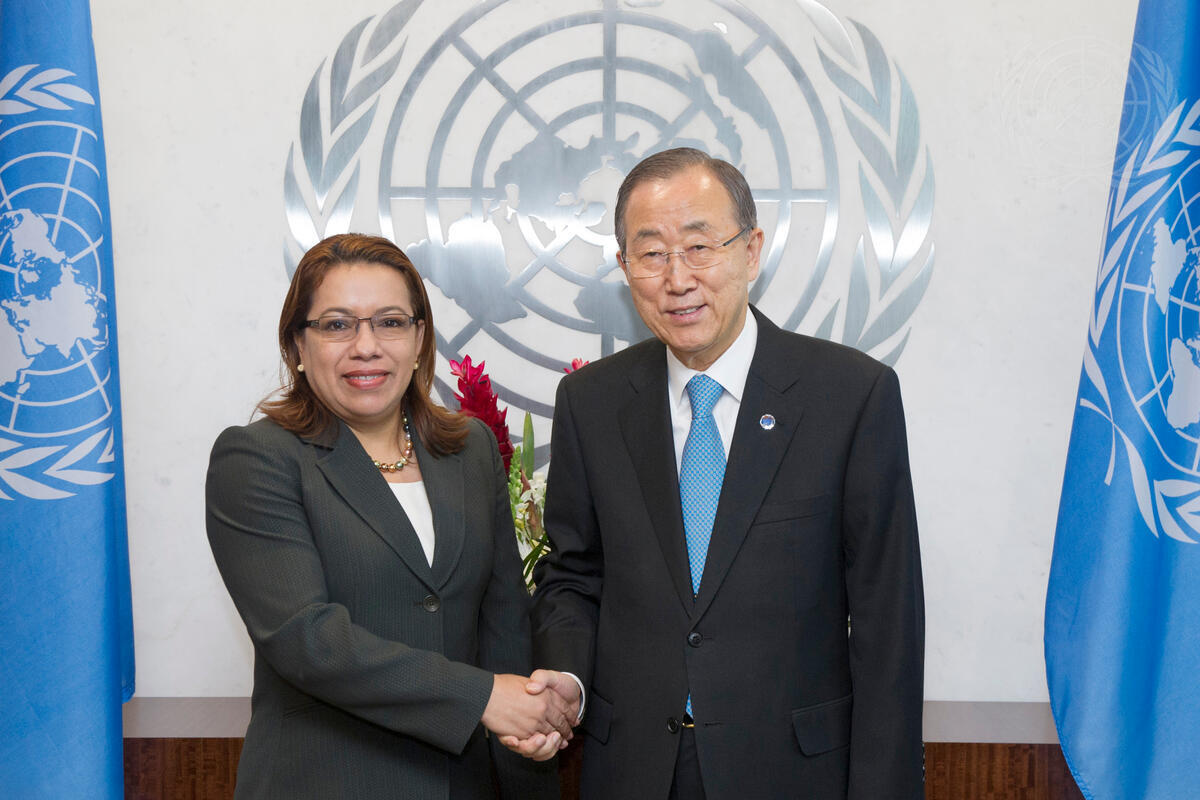 Secretary-General Ban Ki-moon (right) meets with Carolyn Rodrigues-Birkett, Minister for Foreign Affairs of the Republic of Guyana.